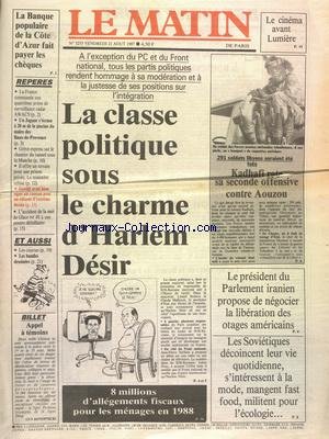 This book MATIN DE PARIS (LE) [No 3255] du 21/08/1987 - LA CLASSE POLITIQUE SOUS LE CHARME D'HARLEM DESIR - LA BANQUE POPULAIRE DE LA COTE D'AZUR FAIT PAYER ES CHEQUES - KADHAFI RATE SA SECONDE OFFENSIVE CONTE AOUZOU - LE PRESIDENT DU PARLEMENT IRANIEN PROPOSE DE NEGOCIER LA LIBERATION DES OTAGES AMERICAINS - LES SOVIETIQUES DECOINCENT LEUR VIE QUOTIENNE you must read.